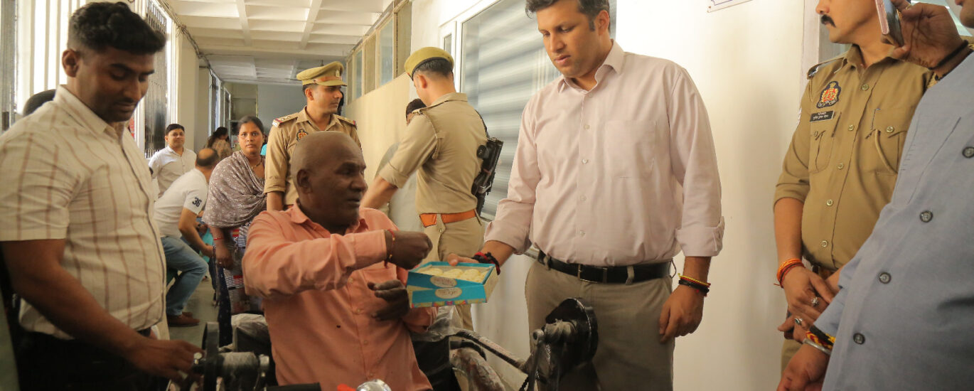 जनता दर्शन के दौरान जिलाधिकारी महोदय द्वारा कई शिकायतों का मौके पर निस्तारण किया गया एवं जूम के माध्यम से संबंधित अधिकारियों से संपर्क कर उन्हें शिकायतों से अवगत कराते हुए गुणवत्तापूर्ण निस्तारण के आदेश दिए। इसी दौरान एक महिला श्रीमती सोनम पुत्री ओमी निवासी डासना मसूरी, गाजियाबाद ने कहा कि वह अपने दिव्यांग पिता के साथ आई है, महोदय ने निवेदन है कि मेरी एक छोटी बहन भी और मेरी विवाह हो चुका है। मै और मेरी माता जी मेहनत मजदूरी कर घर चला रहे थे किन्तु मेरी शादी के बाद उन्हें अत्याधिक आर्थिक तंगी का सामना करना पड़ रहा है। घर में कोई कमाने वाला नही है। जिलाधिकारी महोदय से निवेदन है कि हमारी मदद करें। हमें पता चला है कि आप गरीब, मजबूर, बेसहारा आदि की सहायता करते हैं कृपा हमारी भी सहायता करें। जिलाधिकारी महोदय ने जिला पूर्ति अधिकारी, स्वास्थ्य विभाग, समाज कल्याण विभाग व दिव्यांग कल्याण अधिकारी को निर्देशित किया कि इन जो सहायता हो सकें, योजनाओं के तहत मानवीय संवेदनाओं को ध्यान में रखते हुए की जाएं। जिलाधिकारी महोदय ने मौके पर ही दिव्यांग श्री ओमी को व्हील चैयर देते हुए उनका मुंह मीािा करवाया और सम्बंधित अधिकारियों को निर्देशित किया कि इनका अन्तोदय राशन कार्ड, आयुष्मान कार्ड, दिव्यांग पैशन सहित अन्य योजनाओं को लाभ दिलाया जाएं।