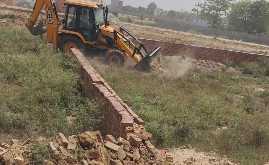 उपाध्यक्ष महोदय के अवैध निर्माण/अवैध कालोनियों के विरूद्ध कार्यवाही किये जाने के निर्देशों के क्रम में आज दिनांक 17.04.2026 को प्रभारी प्रवर्तन जोन-02 के नेतृत्व में ग्लोब शाईन बिल्डर एण्ड डवलपर्स प्रा0लि द्वारा श्री निरंजन फौजदार व श्री अनुज चौधरी द्वारा खसरा सं0-396 राजस्व औरंगाबाद गदाना, हापुड़ रोड, मोदीनगर, गाजियाबाद पर लगभग 30000.0 वर्ग मी0 के भूखण्ड पर लगभग 06 माह पूर्व कार्य प्रारम्भ करते हुए बाउण्ड्रीवॉल व सड़कों के निर्माण हेतु आंशिक भाग में मिट्टी डाले जाने का कार्य में अवैध रूप से प्लॉटिंग कर विकास कार्य करते हुये कालोनी काटी जा रही है। स्थल पर कोई स्वीकृत तलपट मानचित्र नहीं दिखाया गया, अनाधिकृत निर्माण के विरूद्ध ध्वस्तीकरण की कार्यवाही की गयी। उपरोक्त अवैध कालोनी में कालोनाईजर द्वारा बनायी गई सडक, बाउन्ड्रीवॉल, साईट ऑफिस, आदि को ध्वस्त करते हुये सीलिंग की कार्यवाही सम्पादित की गयी। ध्वस्तीकरण/सीलिंग की कार्यवाही के दौरान कोलोनाईजर/निर्माणकर्ता द्वारा भारी विरोध प्रकट किया गया, लेकिन पुलिस व प्राधिकरण प्रवर्तन दस्ते द्वारा प्रभावी कार्यवाही करते हुए उपरोक्त अनाधिकृत रूप से किये गये अवैध निर्माण को ध्वस्त कर दिया गया। ध्वस्तीकरण/सीलिंग की कार्यवाही के समय स्थल पर सहायक अभियन्ता, अवर अभियन्ता, प्रवर्तन जोन-2 के समस्त स्टाफ, प्राधिकरण पुलिस बल व प्राधिकरण प्रवर्तन दस्ता उपस्थित रहा।